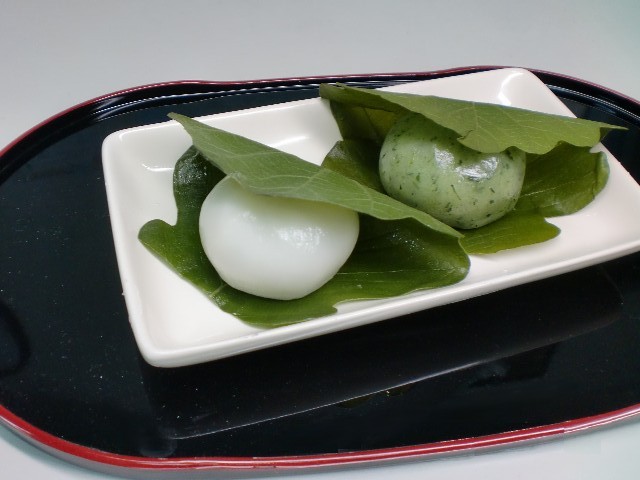 端午の節句には欠かせないかしわ餅です。よもぎはつぶあん・白はこしあんを包んでいます。